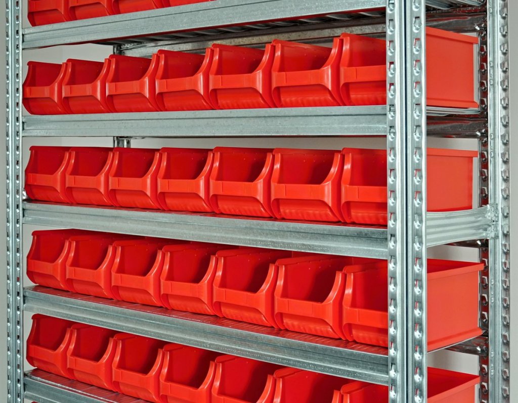 Regal mit Sichtlagerkästen 877851018_VAR_5, Steckregal, 10x Fachboden, Tragkraft 125 kg, Gesamttragkraft 1100 kg, H x B x T 1972 x 1124 x 330 mm, 28x Sichtlagerkasten 456210, 35x Sichtlagerkasten 456208 2 Jahre Garantie