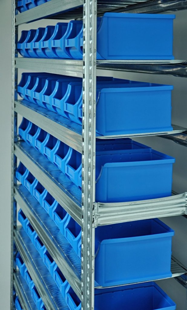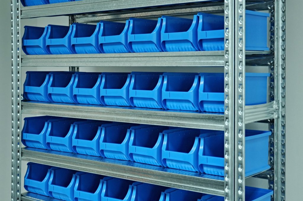 Regal mit Sichtlagerkästen 877851018_VAR_4, Steckregal, 10x Fachboden, Tragkraft 125 kg, Gesamttragkraft 1100 kg, H x B x T 1972 x 1124 x 330 mm, 28x Sichtlagerkasten 456209, 35x Sichtlagerkasten 456208 2 Jahre Garantie