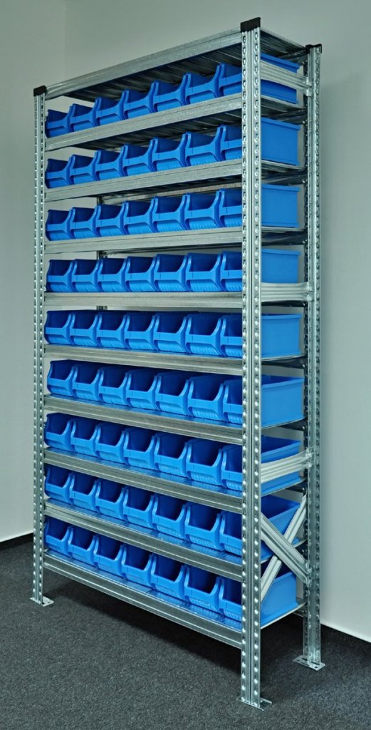 Regal mit Sichtlagerkästen 877851018_VAR_1, Steckregal, 10x Fachboden, Tragkraft 125 kg, Gesamttragkraft 1100 kg, H x B x T 1972 x 1124 x 330 mm, 63x Sichtlagerkasten 456210, 2 Jahre Garantie