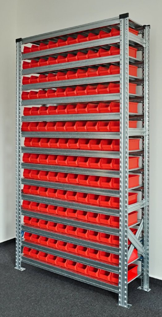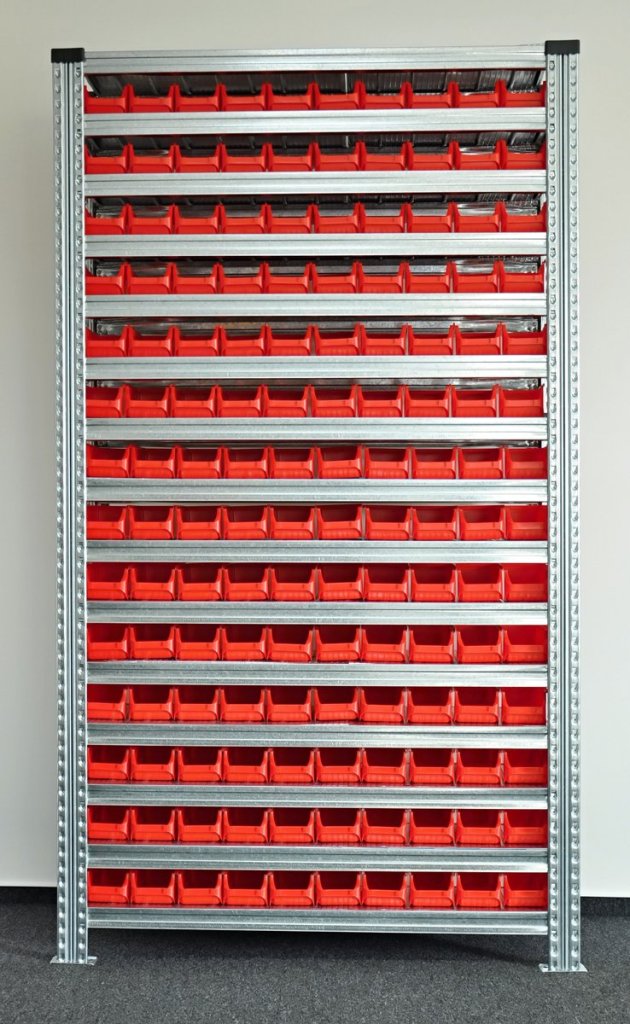 Regal mit Sichtlagerkästen 877851019_VAR_1, Steckregal, 15x Fachboden, Tragkraft 125 kg, Gesamttragkraft 1100 kg, H x B x T 1972 x 1124 x 330 mm, 140x Sichtlagerkasten 456232, 2 Jahre Garantie