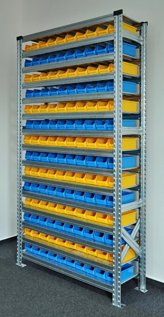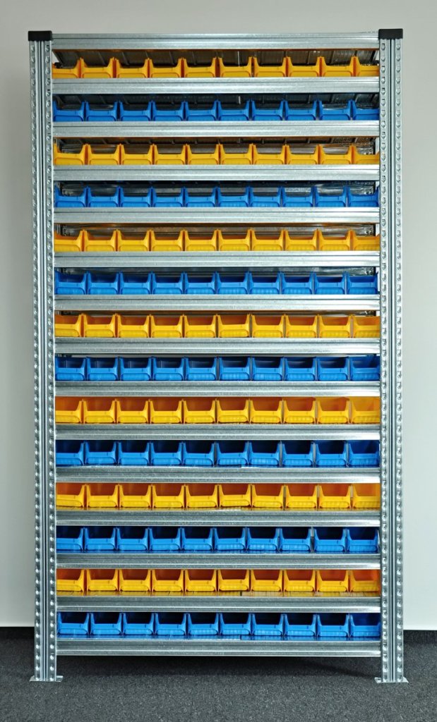 Regal mit Sichtlagerkästen 877851019_VAR_1, Steckregal, 15x Fachboden, Tragkraft 125 kg, Gesamttragkraft 1100 kg, H x B x T 1972 x 1124 x 330 mm, 140x Sichtlagerkasten 456232, 2 Jahre Garantie