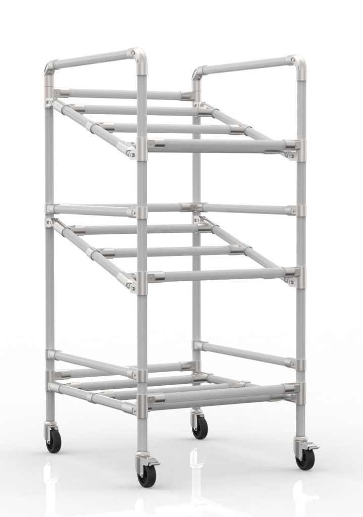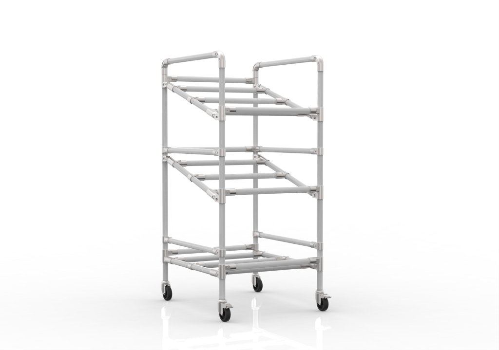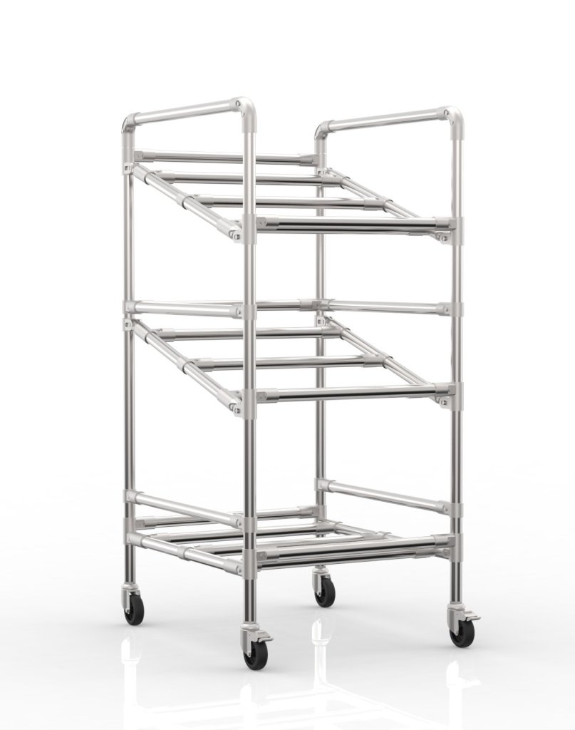 Ein Regalwagen für Behälter mit einer geraden und zwei schrägen Regalböden ist ein praktischer Helfer für die Handhabung in vollständige Beschreibung und Parameter