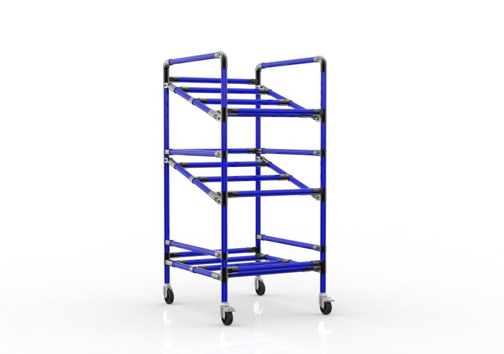 Ein Regalwagen für Behälter mit einer geraden und zwei schrägen Regalböden ist ein praktischer Helfer für die Handhabung in vollständige Beschreibung und Parameter