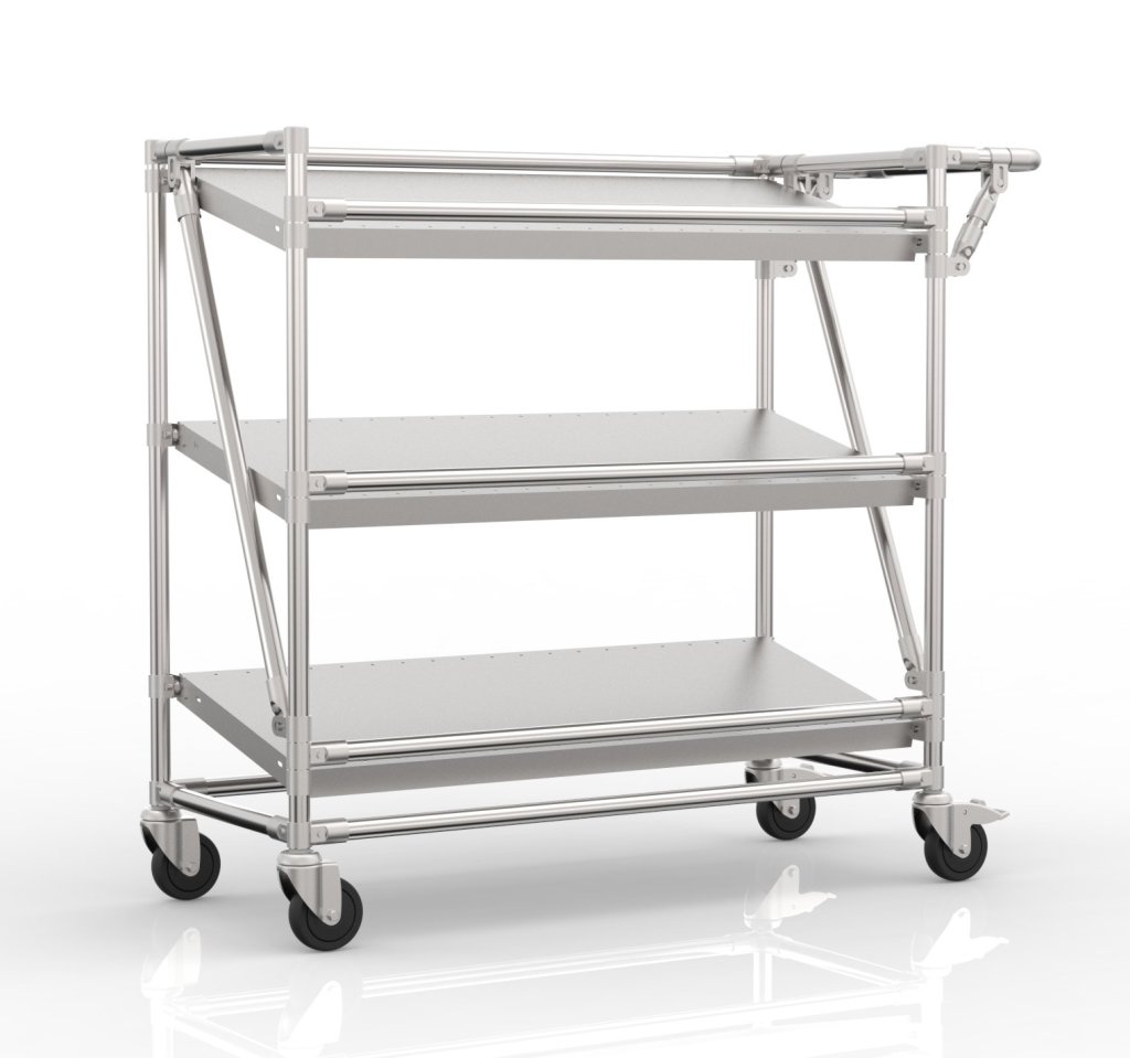 Ein Regalwagen für Behälter mit drei schrägen Regalböden ist ein praktischer Helfer für die Handhabung in Produktionsunternehmen und Logistikzentren, insbesondere im Bereich E-Commerce. Der Wagen ist mit zwei drehbaren Rollen mit Bremse und zwei drehbaren Rollen ohne Bremse mit einem Durchmesser von 100 mm ausgestattet. Der Vorteil dieser Rollen ist der geringe Rollwiderstand, der eine komfortable Handhabung ermöglicht. Die Konfiguration der Rollen kann nach Kundenwunsch geändert werden. Der Wagen ist außerdem mit einem ergonomischen Griff für eine einfachere und bequemere Handhabung ausgestattet. Gesamttragfähigkeit 180 kg, Tragfähigkeit pro Regalboden 60 kg. Abmessungen 1078 x 1066 x 465 mm.