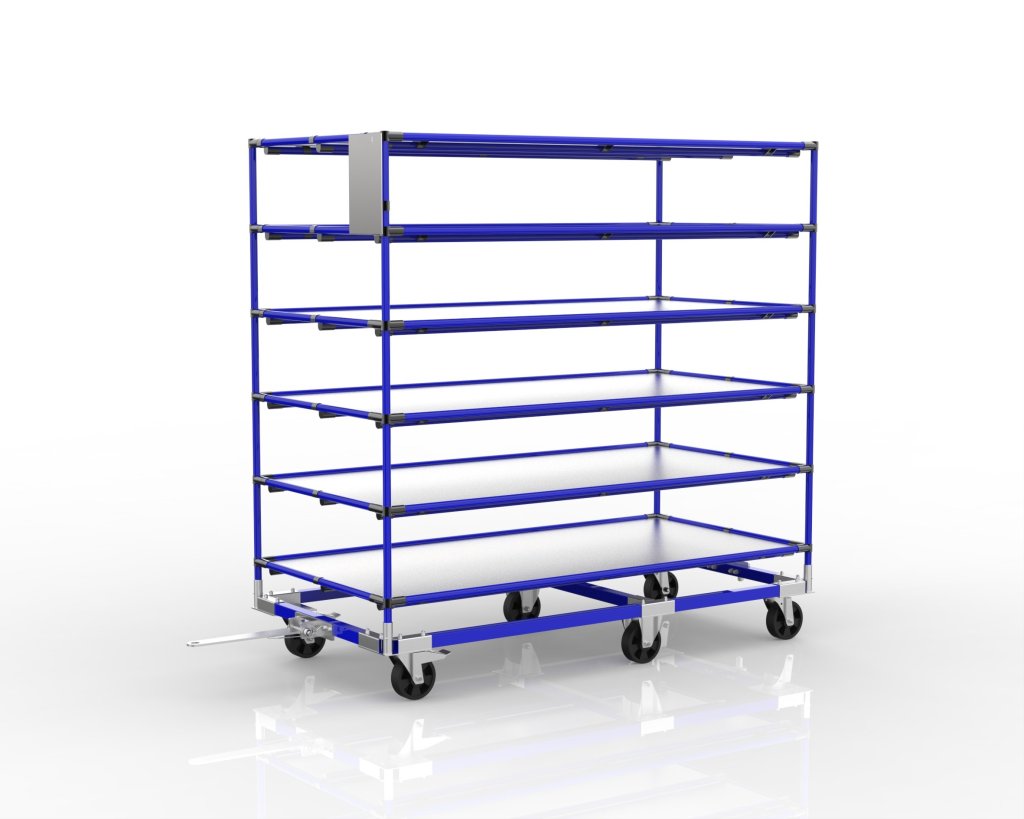 Regalwagen aus einem Vierkantrohr-Fahrgestell mit Aufsatz aus einem Rohrsystem. Möglichkeit, mehrere Wagen zu einem Zug zu verbinden. Geeignet für den Transport von Material und Produkten.