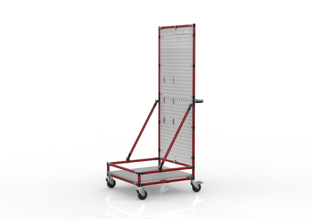 Reinigungswagen zur Einhaltung der 5S-Methodik. Geeignet für die Organisation und Reinigung am Arbeitsplatz. Ausgestattet mit einem Lochblech und 10 Haken sowie einer Laminatplatte mit einer Stärke von 18 mm. Konstruktion aus blauen LP-1100 Rohren. Verbindungen sind mit schwarzem Pulverlack beschichtet.