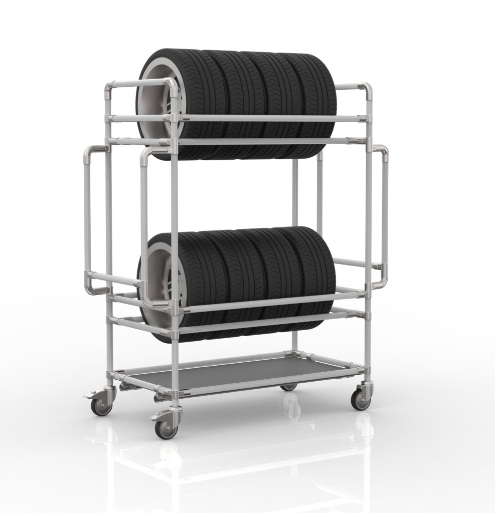 Reifenständer aus einem Rohrbaukastensystem mit drei Regalen. Praktische Lagerung von bis zu 12 Reifen auf drei Ebenen. Ideal für Reifen mit einer Größe von 16" bis 20", der Ständer enthält vier Befestigungsfüße. Die Reifen sind nicht im Lieferumfang enthalten. Tragfähigkeit eines Regals 100 kg, Gesamttragfähigkeit 300 kg. Abmessungen 2000 x 1127 x 465 mm.
