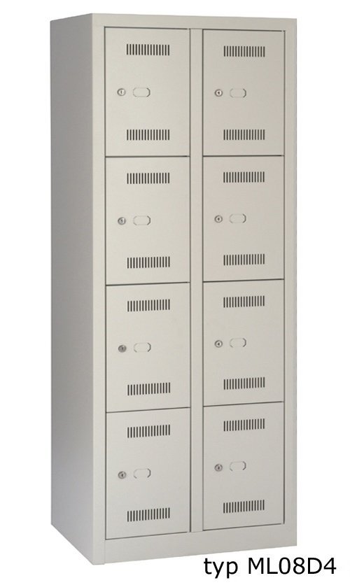 Schließfachschrank Bisley ML06D4, geschweißte Konstruktion, mit Sockel oder mit Füßen. Abteilbreite 300 mm, Höhe 1700 mm, mit Sockel 1806 mm, mit Füßen 1850 mm, mit untergebauter Sitzbank 2100 mm. Sitzbank mit Ausgleichsfüßen. Zylinderschloss als Serie, Zahlendrehschloss oder Drehriegelverschluss für Vorhängeschloss gegen Aufpreis. Korpusfarben RAL 7035 Lichtgrau, verschiedene Türfarbe.