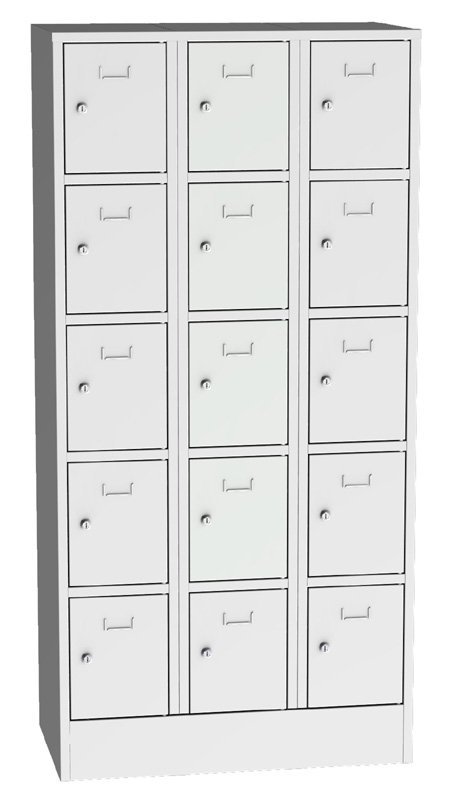 Schrank mit 15 Schließfächern, B x H x T 900 x 1850 x 500 mm. Korpusfarben RAL 7035 Lichtgrau.