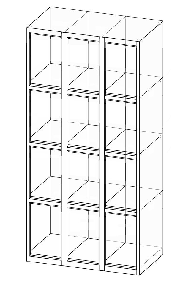 Lochung des Gehäuses - das Schrankgehäuse ist mit Öffnungen für reihenweise Verbindung der Garderobenschränke , mit Öffnungen für die Sockelbefestigung bzw. Befestigung des Schrägdachs, mit Öffnungen für das Aufsetzen auf den Unterbau, mit Öffnungen für das Einsetzen der zusätzlichen Trennwand versehen. |