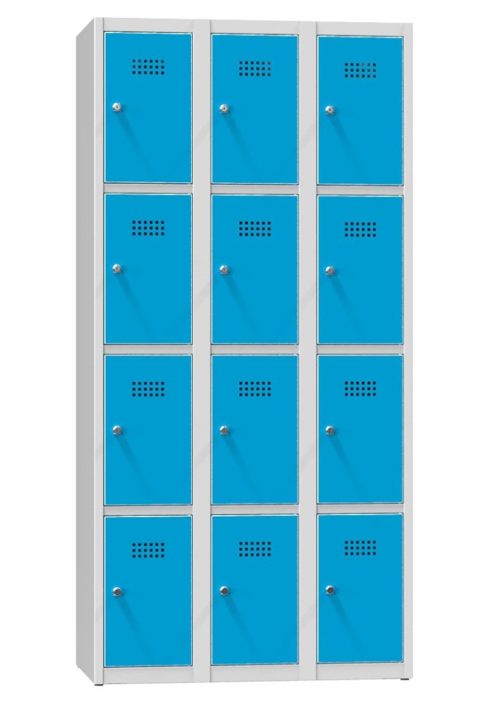 Schrank mit 12 Schließfächern, B x H x T 900 x 1850 x 500 mm. Korpusfarben RAL 7035 Lichtgrau.