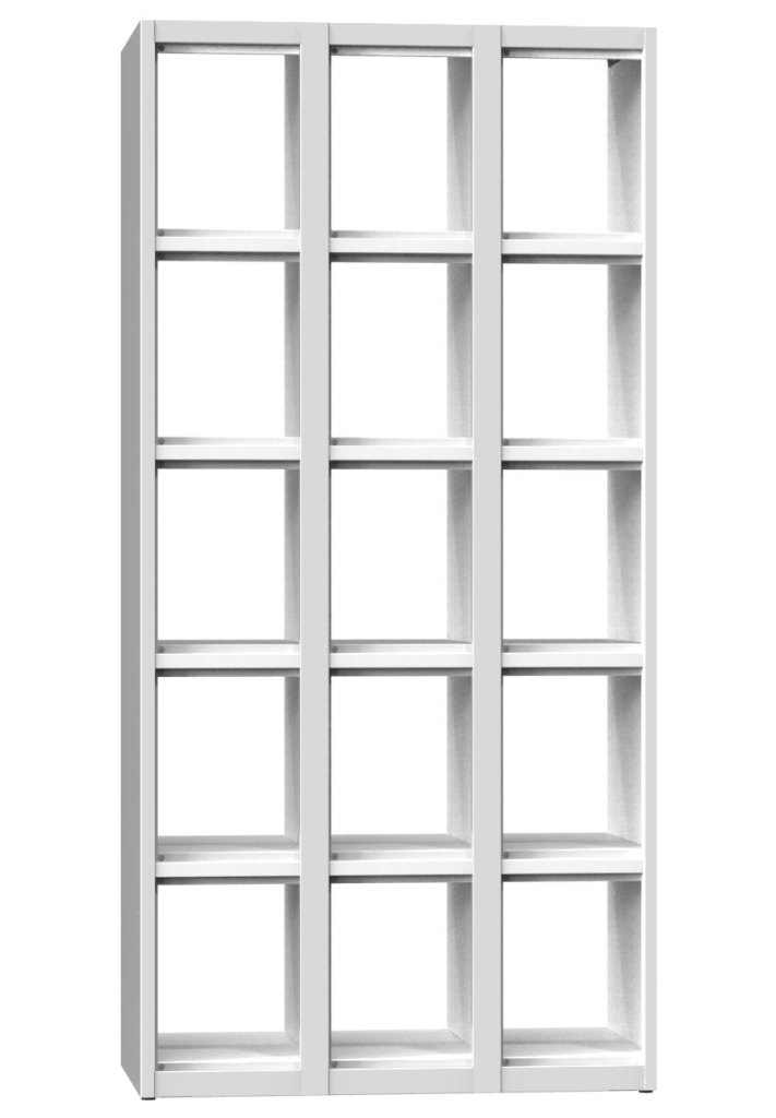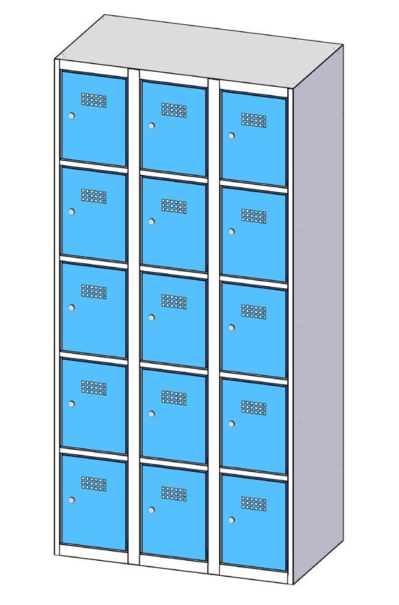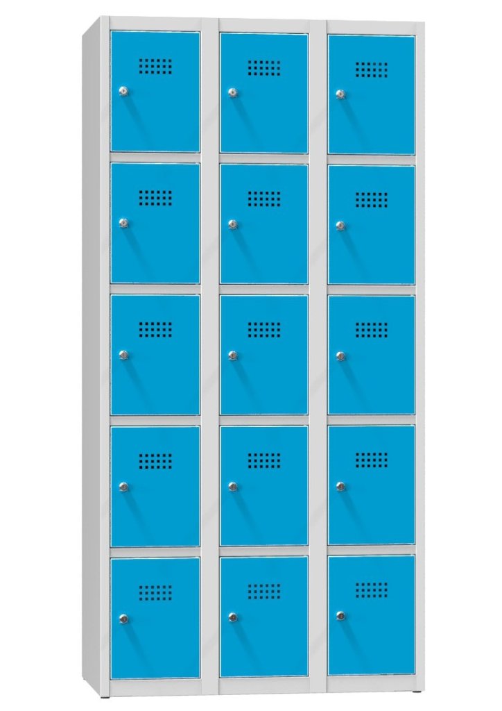 Schrank mit 15 Schließfächern, B x H x T 900 x 1850 x 500 mm. Korpusfarben RAL 7035 Lichtgrau.