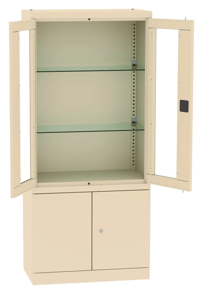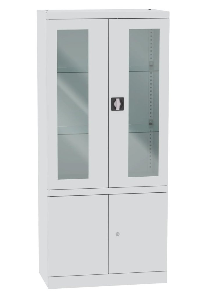 Schrank mit Glas- und Vollblechtüren Malow SML 114, H x B x T  1800 x 800 x 435 mm, 2-Punkt-Verriegelung, 3x Glasfachboden (Traglast 25 kg), verstellbar im Raster von 25 mm. Glastüren und Fachböden aus gehärtetem Glas.