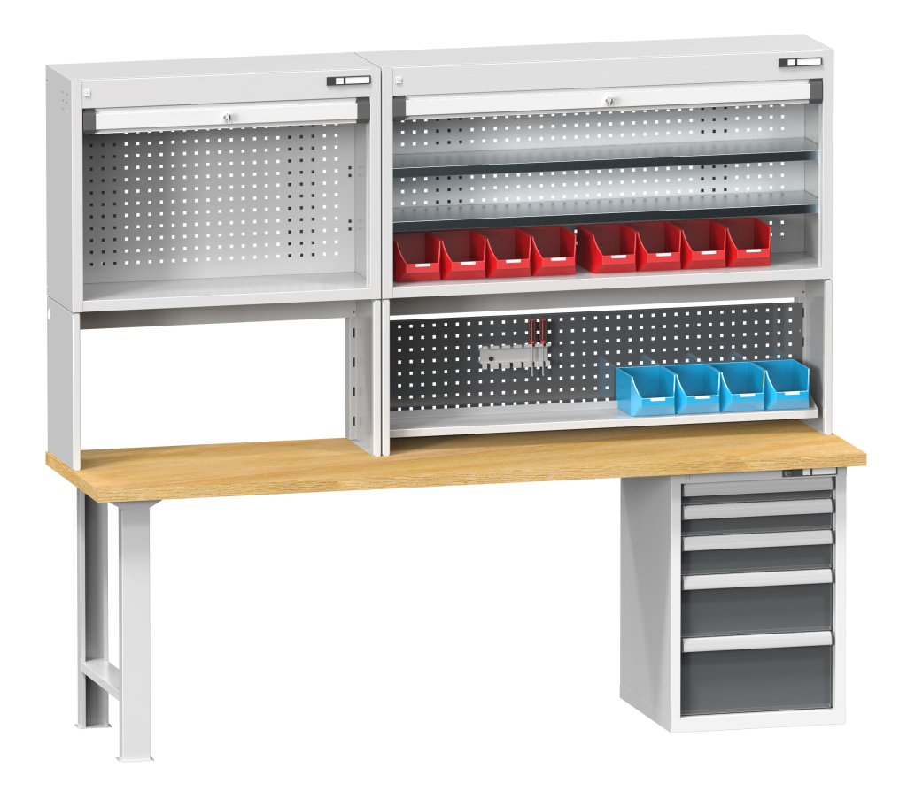 Schrankaufbau, Breite 1500 mm, Höhe 736 mm, Tiefe 350 mm, 1x Fachboden. Rückwand Lochplatte, Rollo Aluminium mit Federaufrollmechanismus mit Drehstangenschloss. Für die Befestigung der Beleuchtung unter dem Schrank ist die magnetische Aufnahme zu bestellen.
