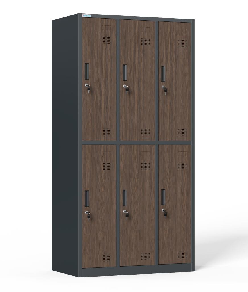 Garderobenschrank HDG-06, demontiert geliefert, H x B x T 1800 x 900 x 500 mm. Zylinderschloss, 2x Schlüssel. Pulverbeschichtet, Korpus-Türenfarbe anthrazit RAL 7016/dunkle Holznachbildung.