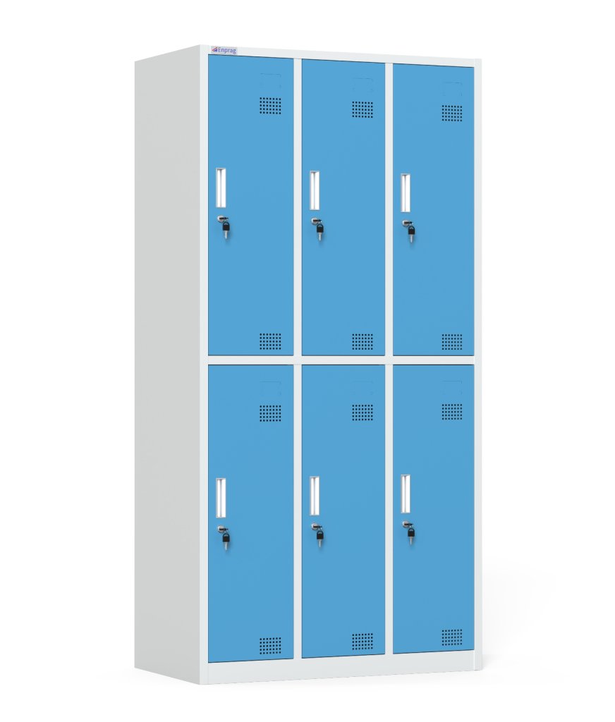Garderobenschrank HDG-S-03, demontiert geliefert, H x B x T 1800 x 900 x 500 mm. Verschluss - Vorhängeschlossverschluss. Pulverbeschichtet, Korpusfarbe RAL 7047 Telegrau, Türenfarbe RAL 5015 Himmelblau.