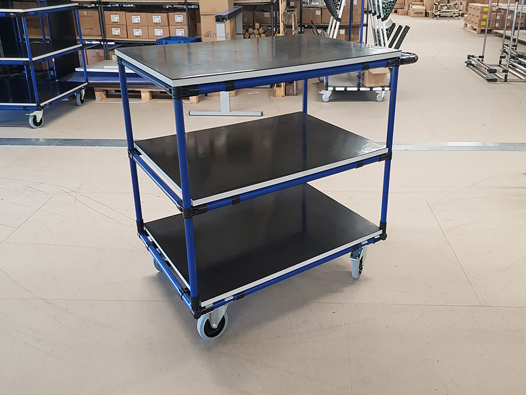 Der Transportwagen aus einem Rohrbausatzsystem ist ein praktischer Helfer, der sich für industrielle Bereiche, Lager und Fertigungshallen eignet. Dank seiner robusten Konstruktion und hohen Tragfähigkeit ist er die ideale Lösung für den Transport einer Vielzahl von Waren und Materialien. Eine Laminatplatte mit einer Dicke von 18 mm bietet eine feste und stabile Ablagefläche. Die Tragfähigkeit des Wagens beträgt 300 kg, die Tragfähigkeit pro Ebene 100 kg. Der Wagen ist mit Rollen mit einem Durchmesser von 120 mm ausgestattet, die eine einfache und reibungslose Bewegung ermöglichen.