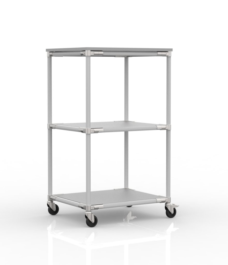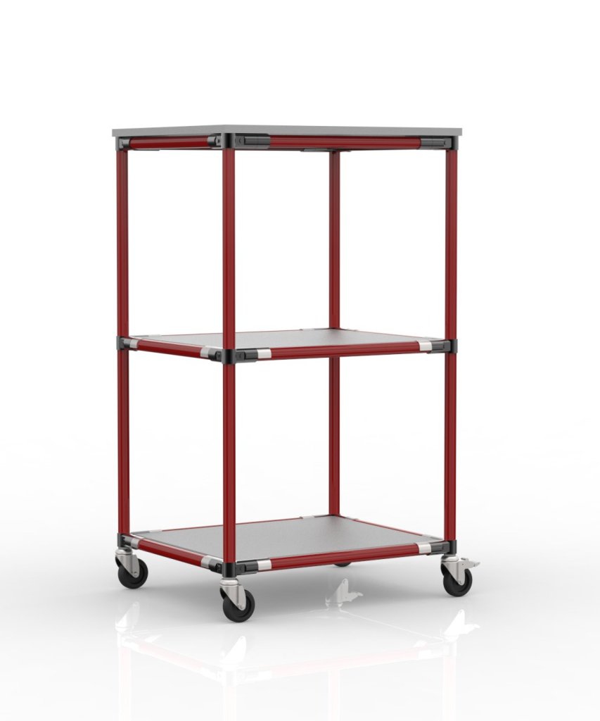 Ein Regalwagen aus einem Rohrbaukastensystem, geeignet für Industrieumgebungen, Lager und Produktionshallen. Geeignet für den Transport von Waren und Materialien. Laminatplatte mit einer Stärke von 18 mm, Tragfähigkeit des Wagens 150 kg, Tragfähigkeit pro Etage 50 kg.