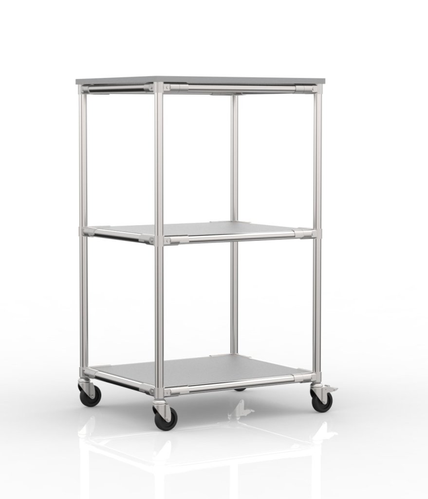 Ein Regalwagen aus einem Rohrbaukastensystem, geeignet für Industrieumgebungen, Lager und Produktionshallen. Geeignet für den Transport von Waren und Materialien. Laminatplatte mit einer Stärke von 18 mm, Tragfähigkeit des Wagens 150 kg, Tragfähigkeit pro Etage 50 kg.