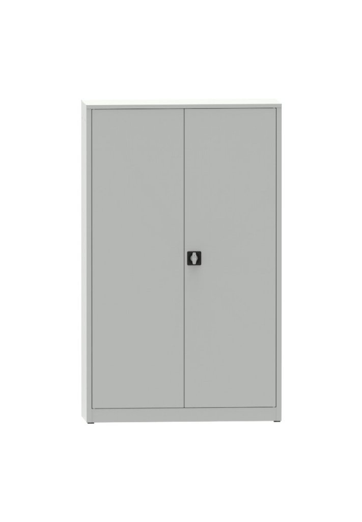 Universal-Schrank mit Sockel, 2 Türen, 4 Fachböden, B x H x T 1200 x 1950 x 400 mm, Türen auch als verglaste oder mit laminierte Spanplatte (Buche, Kirsche, Birke) und Drahtgittertür lieferbar. Korpusfarben RAL 7035 Lichtgrau.