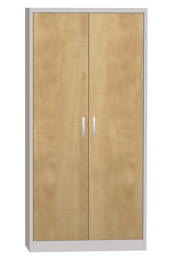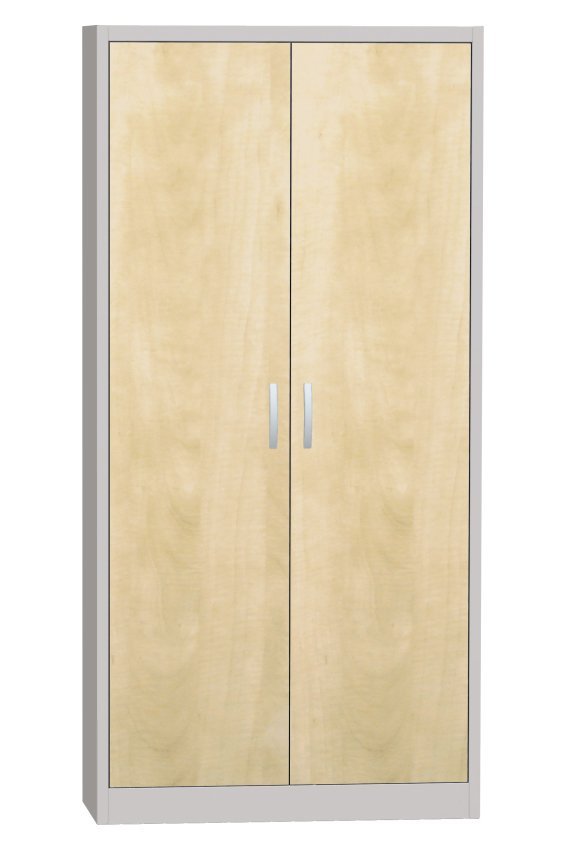 Universal-Schrank mit Sockel, 2 Türen, 5 Fachböden, B x H x T 800 x 1950 x 400 mm, Türen auch als verglaste oder mit laminierte Spanplatte (Buche, Kirsche, Birke) und Drahtgittertür lieferbar. Korpusfarben RAL 7035 Lichtgrau.