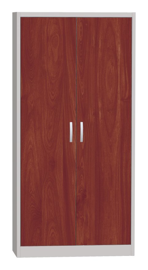 Universal-Schrank mit Sockel, 2 Türen, 4 Fachböden, B x H x T 950 x 1950 x 400 mm, Türen laminierte im Holzdekor (Buche, Kirsche, Birke). Korpusfarben RAL 7035 Lichtgrau.