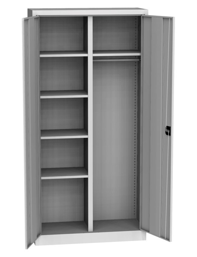 Universal-Schrank mit Sockel, 2 Türen, 4 Fachböden, B x H x T 950 x 1950 x 400 mm, Türen auch als verglaste oder mit laminierte Spanplatte (Buche, Kirsche, Birke) und Drahtgittertür lieferbar. Korpusfarben RAL 7035 Lichtgrau.