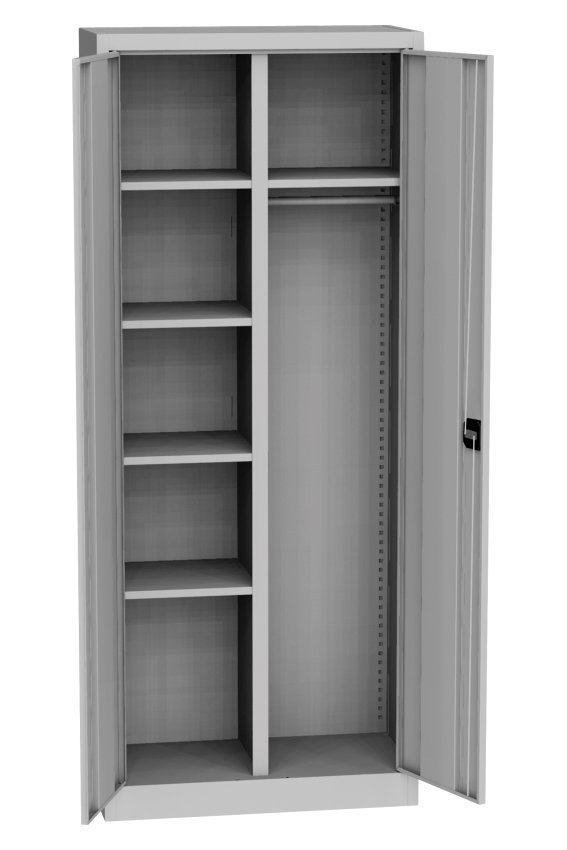 Universal-Schrank mit Sockel, 2 Türen, 4 Fachböden, B x H x T 800 x 1950 x 400 mm, Türen auch als verglaste oder mit laminierte Spanplatte (Buche, Kirsche, Birke) und Drahtgittertür lieferbar. Korpusfarben RAL 7035 Lichtgrau.