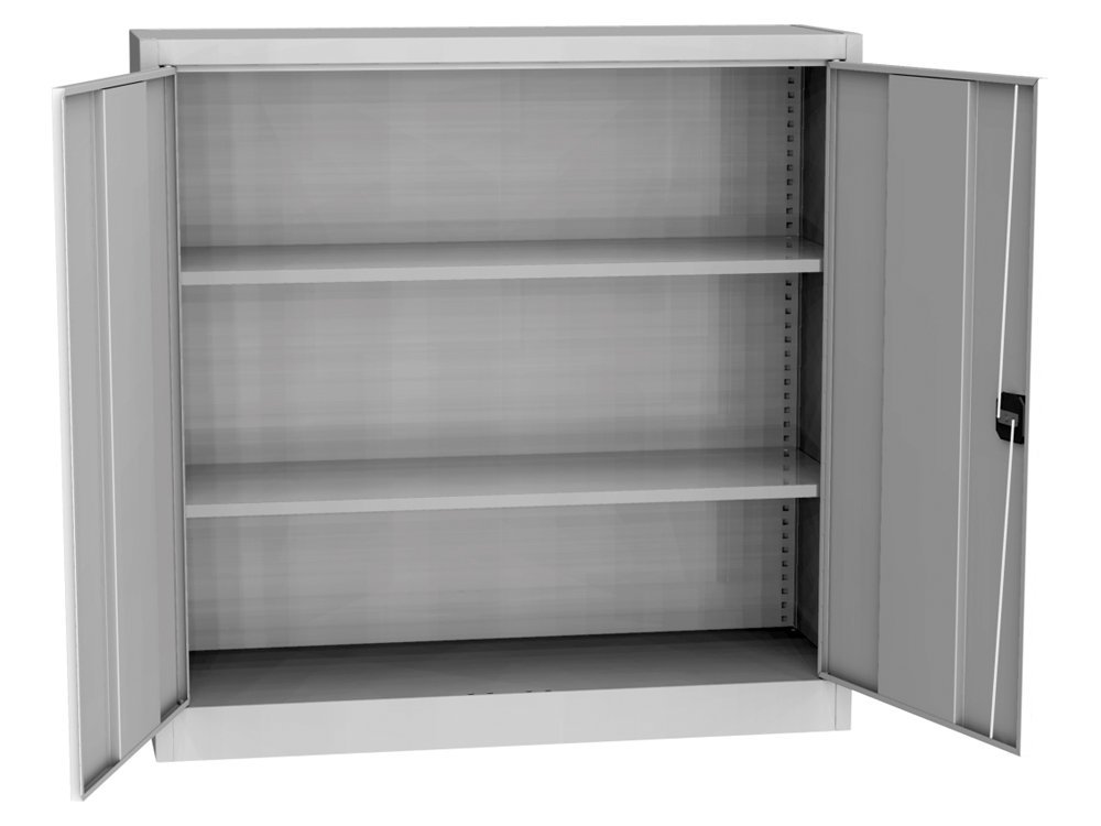 Universal-Schrank mit Sockel, 2 Türen, 2 Fachböden, B x H x T 800 x 1150 x 400 mm. Türen auch als verglaste oder laminierte im Holzdekor (Buche, Kirsche, Birke) lieferbar. Korpusfarben RAL 7035 Lichtgrau.