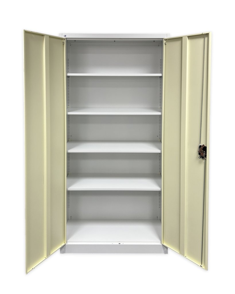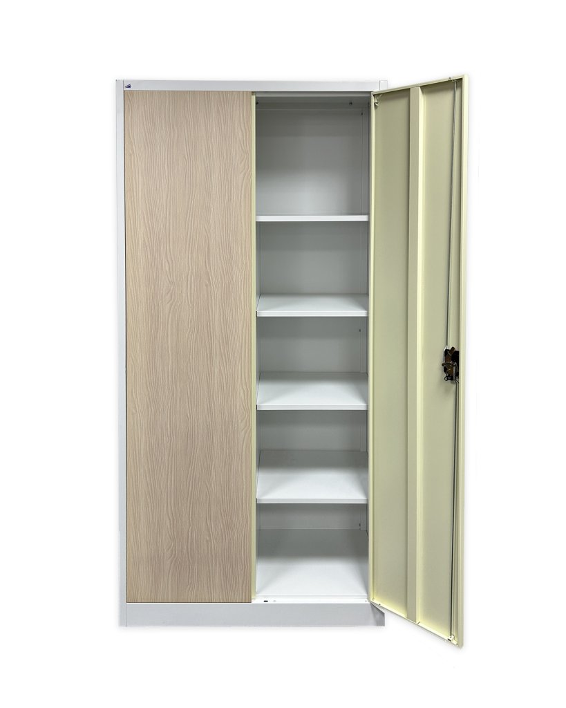 Universalschrank C01, demontiert, aus Stahlblech 0,6 mm. H x B x T 1950 x 900 x 400 mm, 4x Fachboden, Zylinderschloss mit 2 Schlüssel. Pulverbeschichtet, Korpus Farbe weiß RAL 9003/Nachahmung helles Holz.