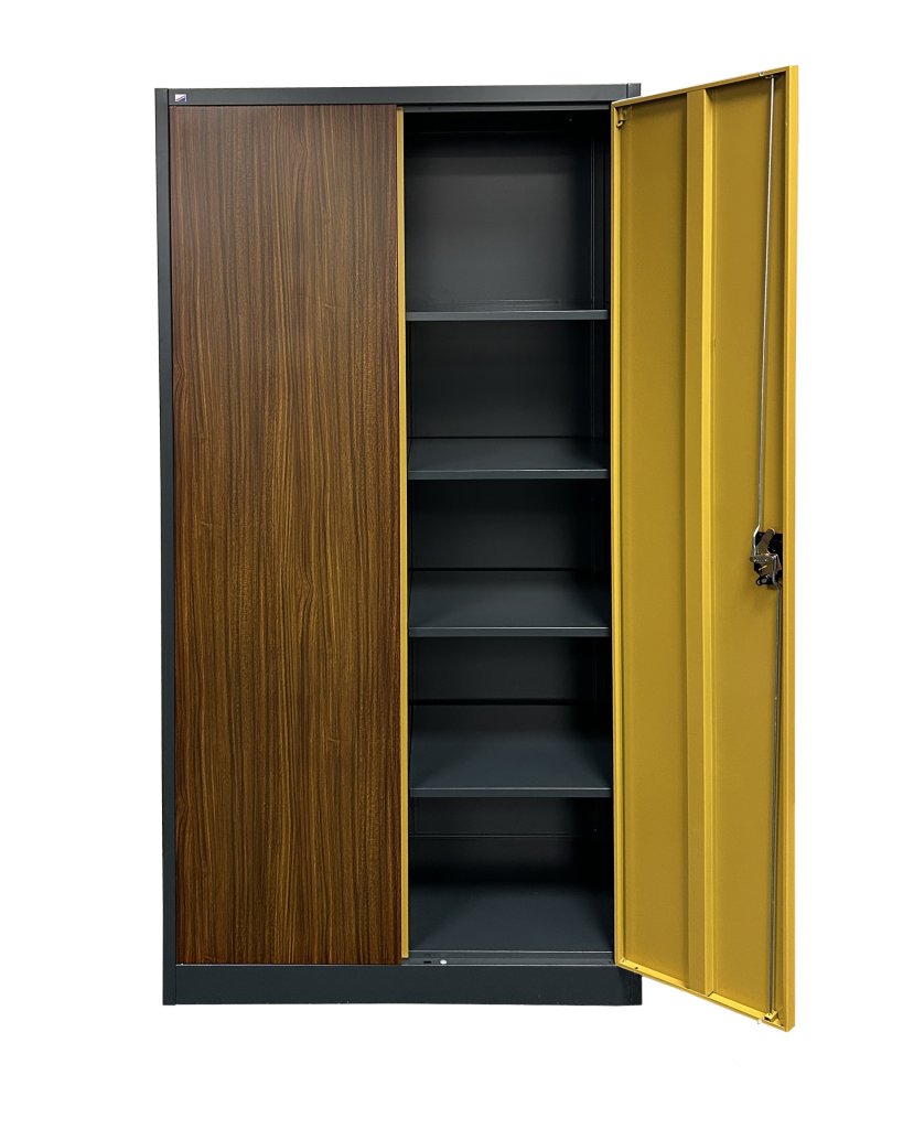 Universalschrank C01B, demontiert, aus Stahlblech 0,6 mm. H x B x T 1000 x 900 x 400 mm,1x Fachboden, Zylinderschloss mit 2 Schlüssel. Pulverbeschichtet, Korpus Farbe anthrazit RAL 7016/Nachahmung dunkles Holz.