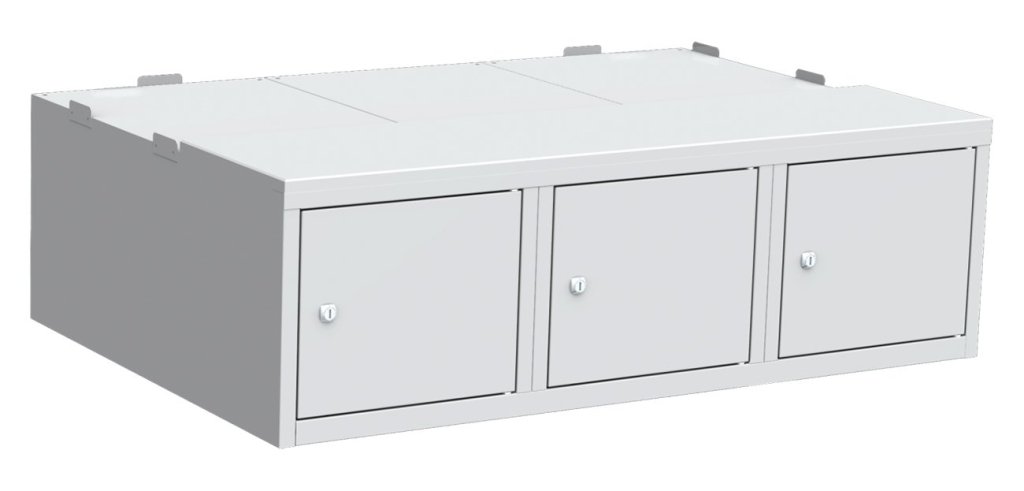 Untergebaute Box, 3 Türen, B x H x T 900 x 370 x 810 mm. Korpusfarben RAL 7035 Lichtgrau.