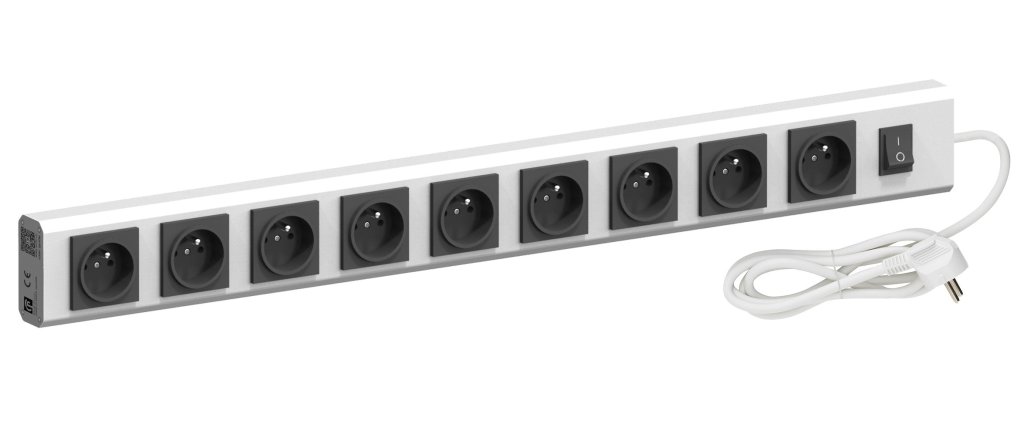 Verlängerungszuleitung 700 mm, 9x Steckdose 230 V / 16A, 1x Schalter 230V / 16A, Anschlusskabel 3 m mit einer Ableitung von der Seite des Profils. Breite 700 mm, Höhe 73 mm, Tiefe 34 mm. Wird mit magnetischer Aufnahme geliefert.