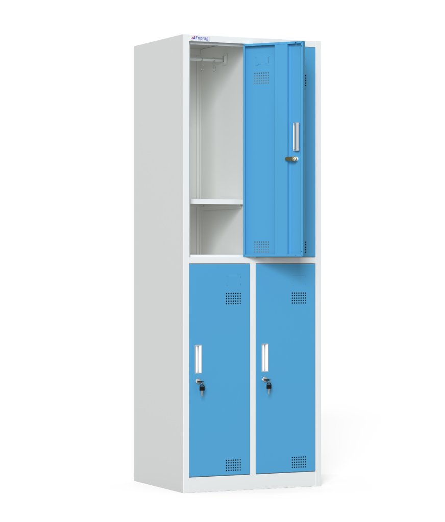 Garderobenschrank HDG-S-03, demontiert geliefert, H x B x T 1800 x 900 x 500 mm. Verschluss - Vorhängeschlossverschluss. Pulverbeschichtet, Korpusfarbe RAL 7047 Telegrau, Türenfarbe RAL 5015 Himmelblau.