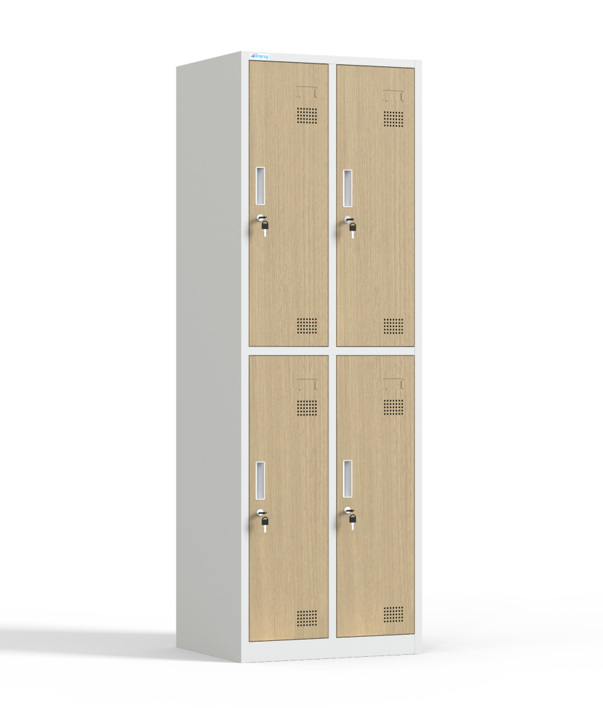 Garderobenschrank HDG-04, demontiert geliefert, H x B x T 1800 x 600 x 500 mm. Zylinderschloss, 2x Schlüssel. Pulverbeschichtet, Korpus-Türenfarbe RAL 7047 Telegrau/ Nachahmung helles Holz.