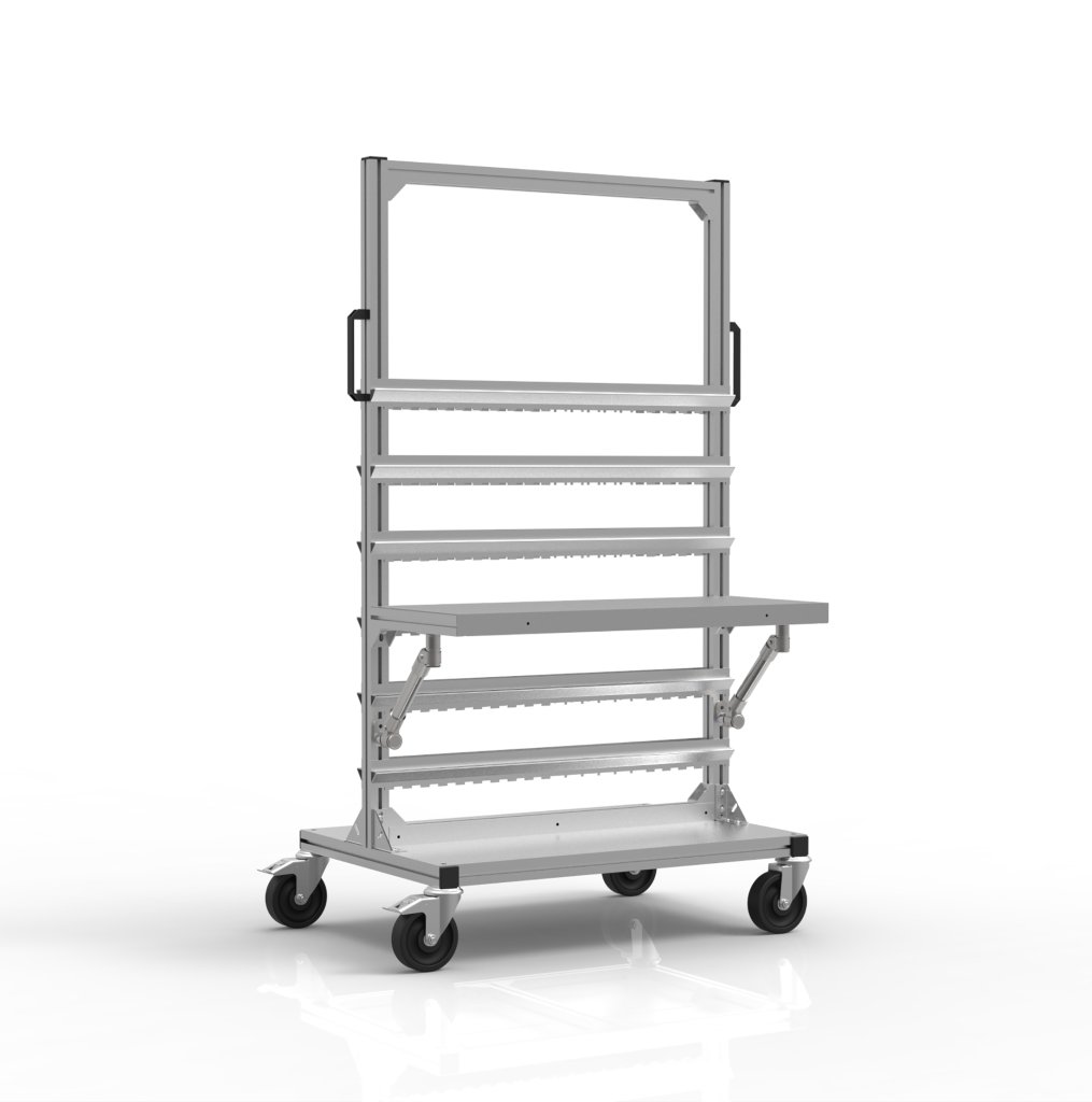 Der Wagen zum Aufhängen von KLT-Boxen ist ein praktischer Helfer für den Umgang mit Kisten und Materialien in industriellen Umgebungen. Der Wagen besteht aus Aluminiumprofilen, was nicht nur Festigkeit, sondern auch die Haltbarkeit der gesamten Konstruktion garantiert. Teil des Wagens ist auch ein ergonomischer schwarzer Griff, der eine bequeme Handhabung und einfache Steuerung des Wagens ermöglicht. Der Wagen ist mit 2 drehbaren Rädern mit Bremse und einem Durchmesser von 125 mm sowie 2 drehbaren Rädern ohne Bremse mit einem Durchmesser von 125 mm ausgestattet. Tragfähigkeit 400 kg. Abmessungen 1550 x 855 x 600 mm.