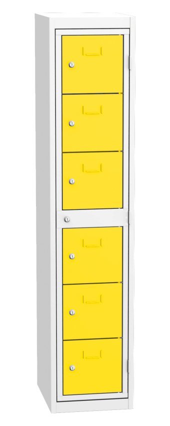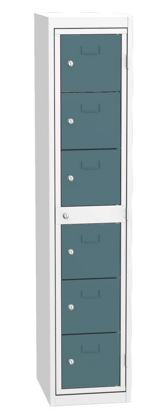 Wäscheausgabeschrank, für die Ausgabe reiner Berufskleidung, B x H x T 380 x 1770 x 460 mm. Zentralrahmen und 6 Ausgabekasten für die Bedienung mit Zylinderschloss. Korpusfarbe RAL 7035 Lichtgrau.