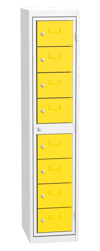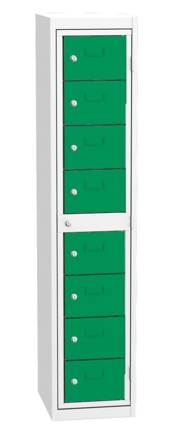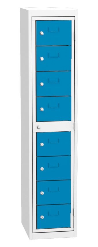 Wäscheausgabeschrank, für die Ausgabe reiner Berufskleidung, B x H x T 380 x 1770 x 460 mm. Zentralrahmen und 6 Ausgabekasten für die Bedienung mit Zylinderschloss. Korpusfarbe RAL 7035 Lichtgrau.