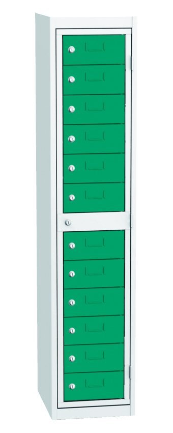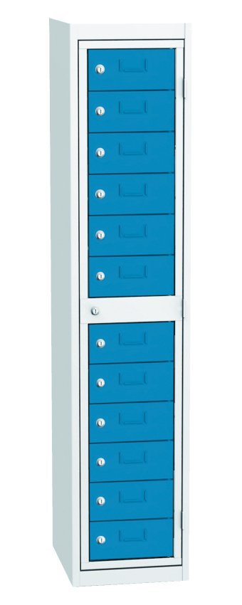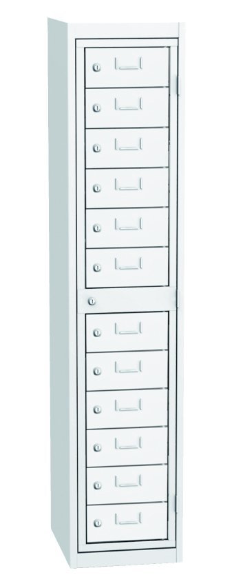 Wäscheausgabeschrank, für die Ausgabe reiner Berufskleidung, B x H x T 380 x 1770 x 460 mm. Zentralrahmen und 6 Ausgabekasten für die Bedienung mit Zylinderschloss. Korpusfarbe RAL 7035 Lichtgrau.