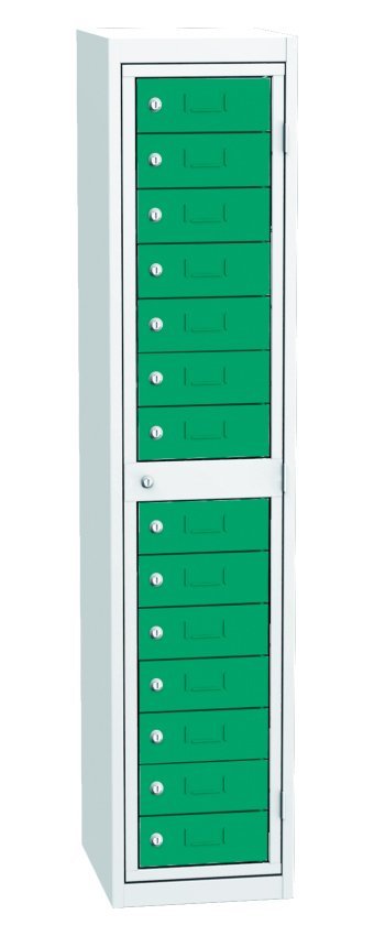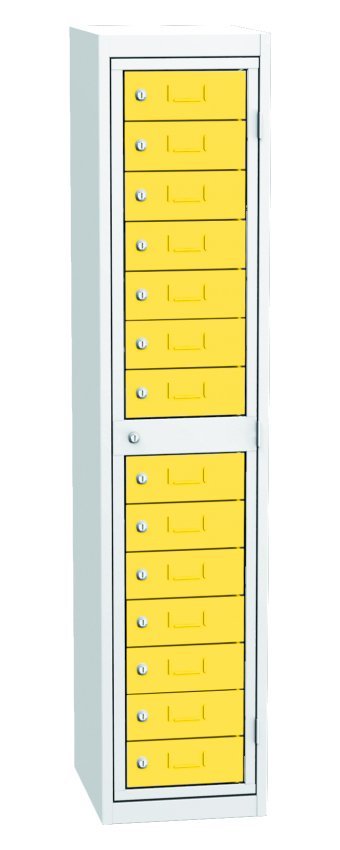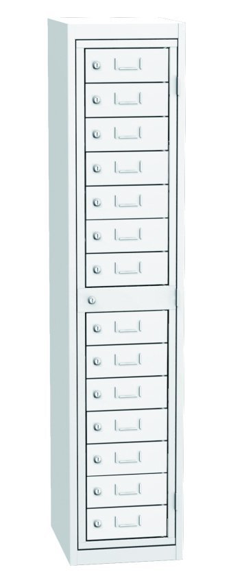 Wäscheausgabeschrank, für die Ausgabe reiner Berufskleidung, B x H x T 380 x 1770 x 460 mm. Zentralrahmen und 6 Ausgabekasten für die Bedienung mit Zylinderschloss. Korpusfarbe RAL 7035 Lichtgrau.