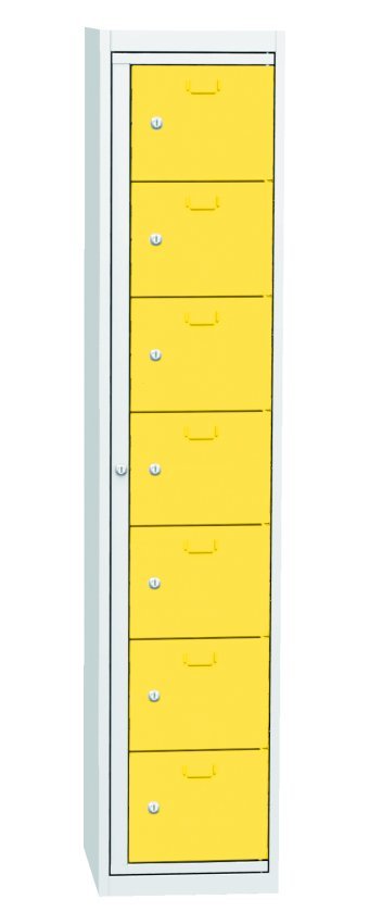 Wäscheausgabeschrank, für die Ausgabe reiner Berufskleidung, B x H x T 380 x 1770 x 460 mm. Zentralrahmen und 6 Ausgabekasten für die Bedienung mit Zylinderschloss. Korpusfarbe RAL 7035 Lichtgrau.