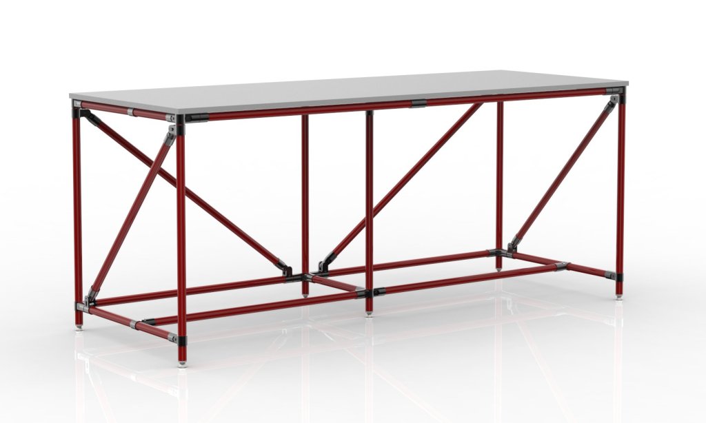 Werkbank aus einem Rohrbaukastensystem mit einer Arbeitsplatte aus laminiertem Holz, 18 mm dick, und vier verstellbaren Füßen. vollständige Beschreibung und Parameter