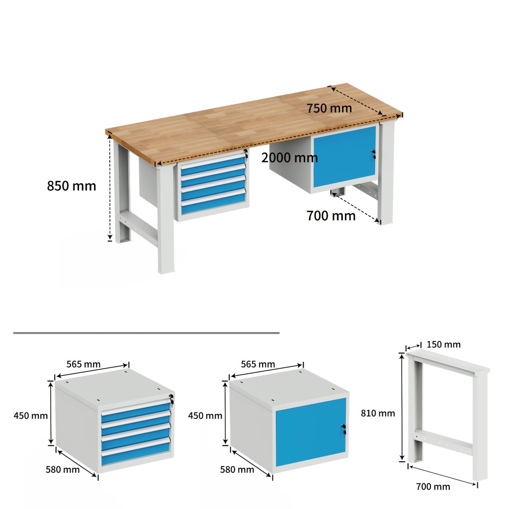 Werkbank EN_2024D, Leimholzplatte Buche, Stärke 40 mm, Fußgestell-Maße H x B x T 810 x 150 x 699 mm, Tragkraft 500 kg, Tischplatten-Maße  850 x 2000 x 750 mm, Gestellfarbe RAL 7035 Lichtgrau, 2x Hängecontainer (4x Schublade und 1x Tür)  H x B x T  450 x 565 x 580 mm, Schubladen-/Türenfarbe RAL 5012 Himmelblau.