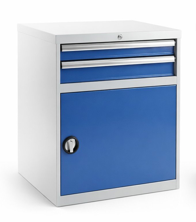 Zweischubladen‑Werkbankcontainer mit Türen, Breite 717 mm, Höhe 800 mm, Tiefe 727 mm, 1× Schublade 75 mm, 1× Schublade 100 mm, 1× Fachboden. Korpusfarbe RAL 7035 Lichtgrau, Schubladenfarbe RAL 5012 Blau.