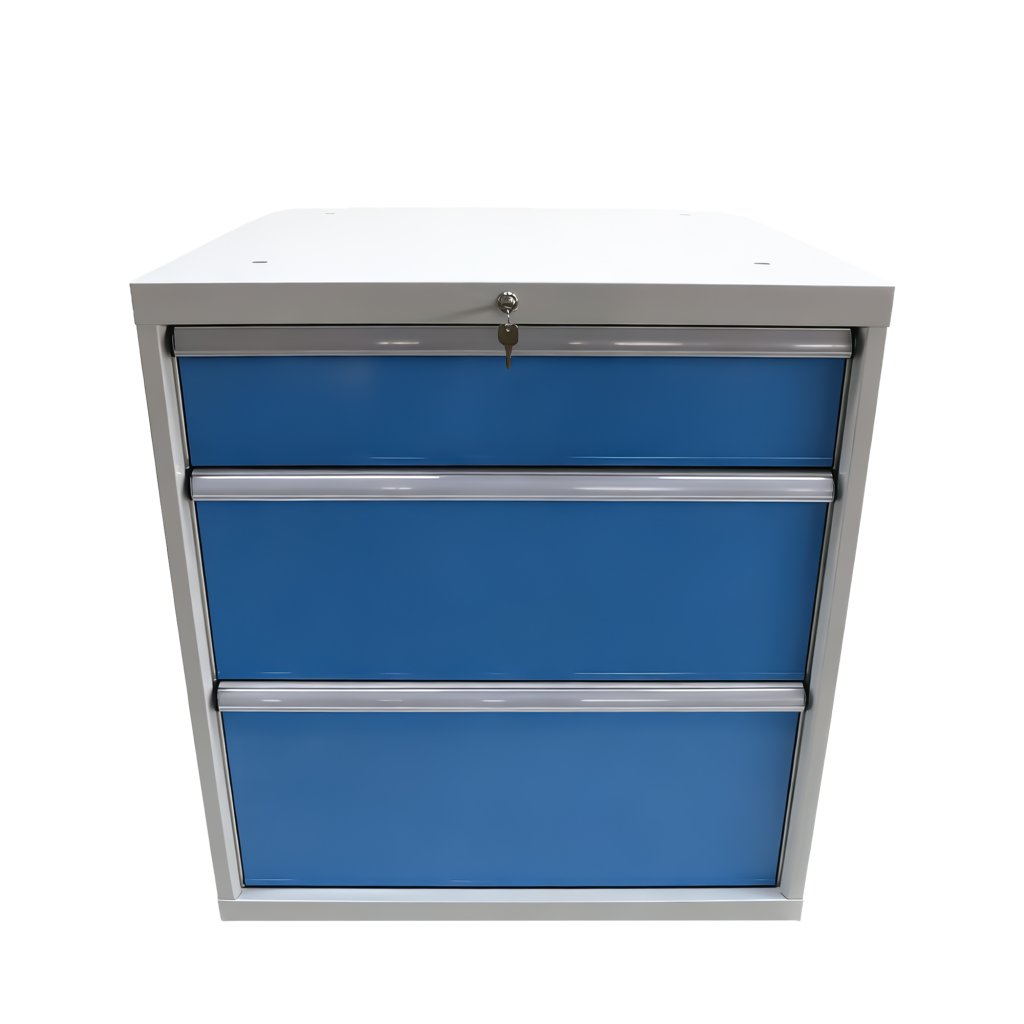 Dreischubladen‑Werkbankcontainer, Breite 717 mm, Höhe 800 mm, Tiefe 727 mm, 1× Schublade 150 mm, 1× Schublade 250 mm, 1× Schublade 300 mm. Korpusfarbe RAL 7035 Lichtgrau, Schubladenfarbe RAL 5012 Blau.