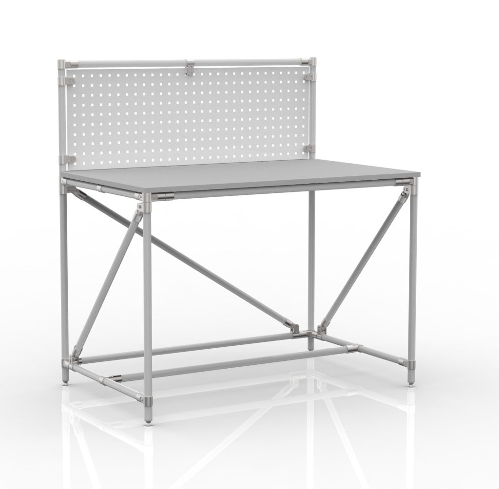 Werkbank aus einem Rohrbausatzsystem mit einem Perforationspaneel. Enthalten sind eine Arbeitsplatte aus laminiertem Holz, ein Perforationspanel mit den Maßen 1117 x 393 mm und vier höhenverstellbare Füße. Tragfähigkeit bei gleichmäßiger Lastverteilung 100 kg. Maße 1282 x 1200 x 750 mm.