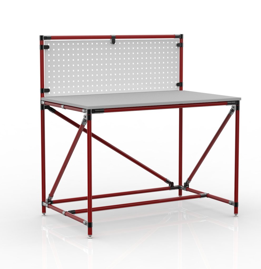 Werkbank aus einem Rohrbausatzsystem mit einem Perforationspaneel. Enthalten sind eine Arbeitsplatte aus laminiertem Holz, ein vollständige Beschreibung und Parameter