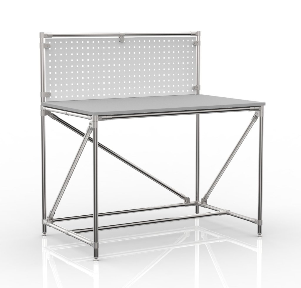 Werkbank aus einem Rohrbausatzsystem mit einem Perforationspaneel. Enthalten sind eine Arbeitsplatte aus laminiertem Holz, ein vollständige Beschreibung und Parameter