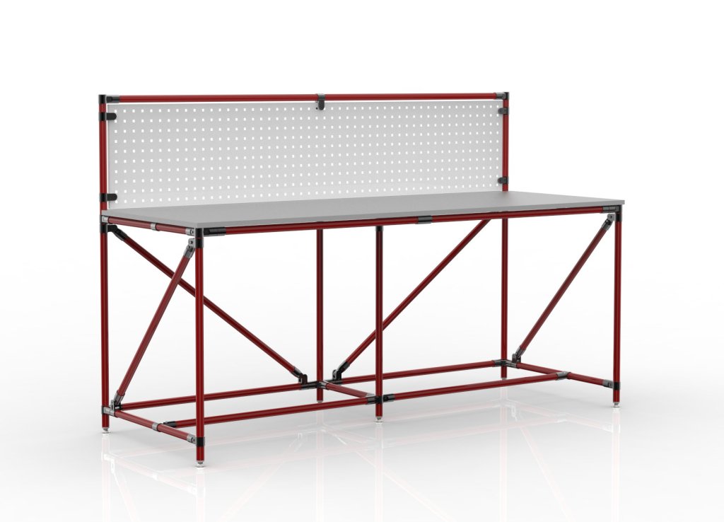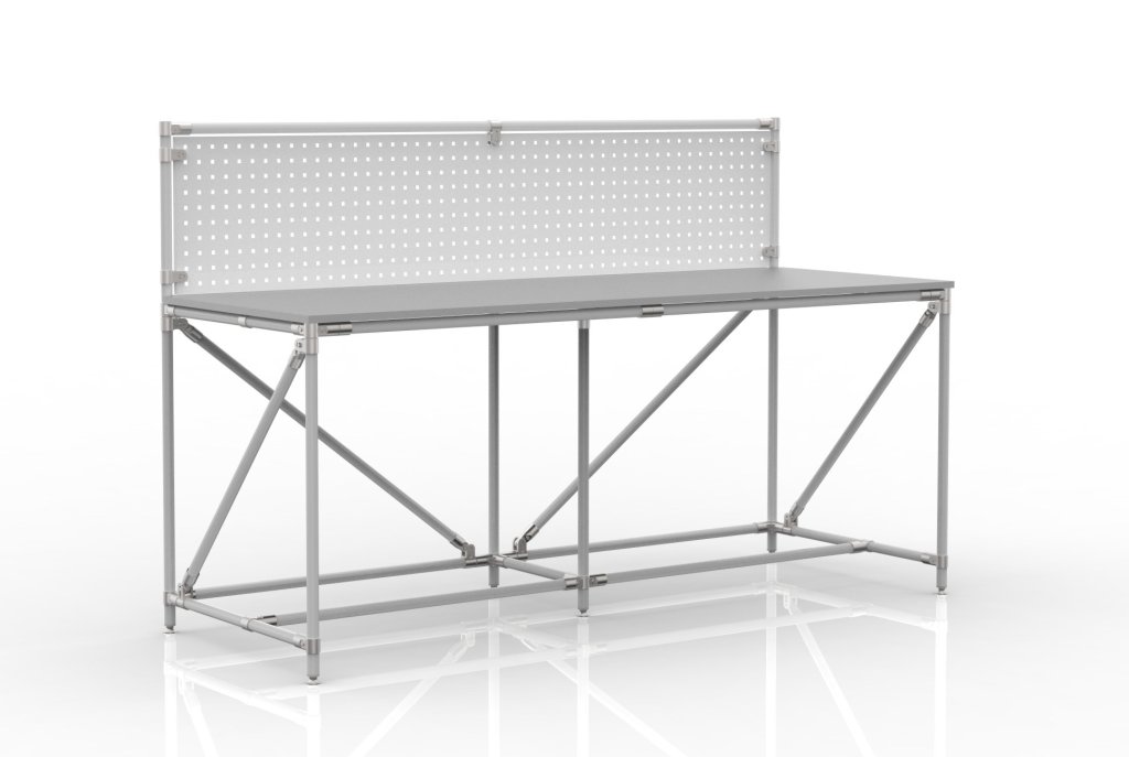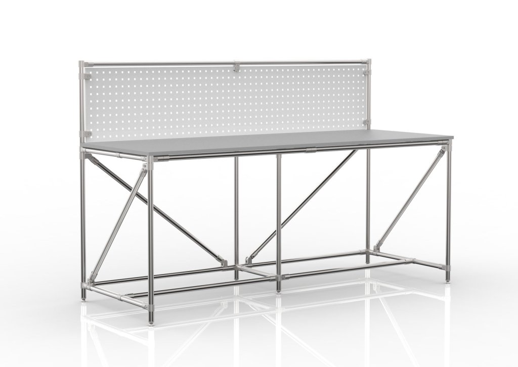 Werkbank aus einem Rohrbausatzsystem mit einem Perfopanel. Enthalten sind eine doppelseitig laminierte Spanplatte mit einer Dicke von 18 mm, ein Perfopanel zur Aufbewahrung von Werkzeugen oder Boxen und vier höhenverstellbare Füße. Tragfähigkeit bei gleichmäßiger Lastverteilung 100 kg. Maße 1282 x 2000 x 750 mm.