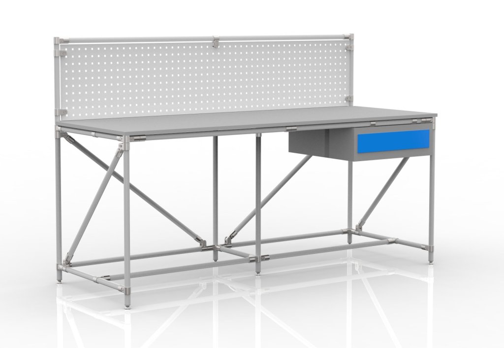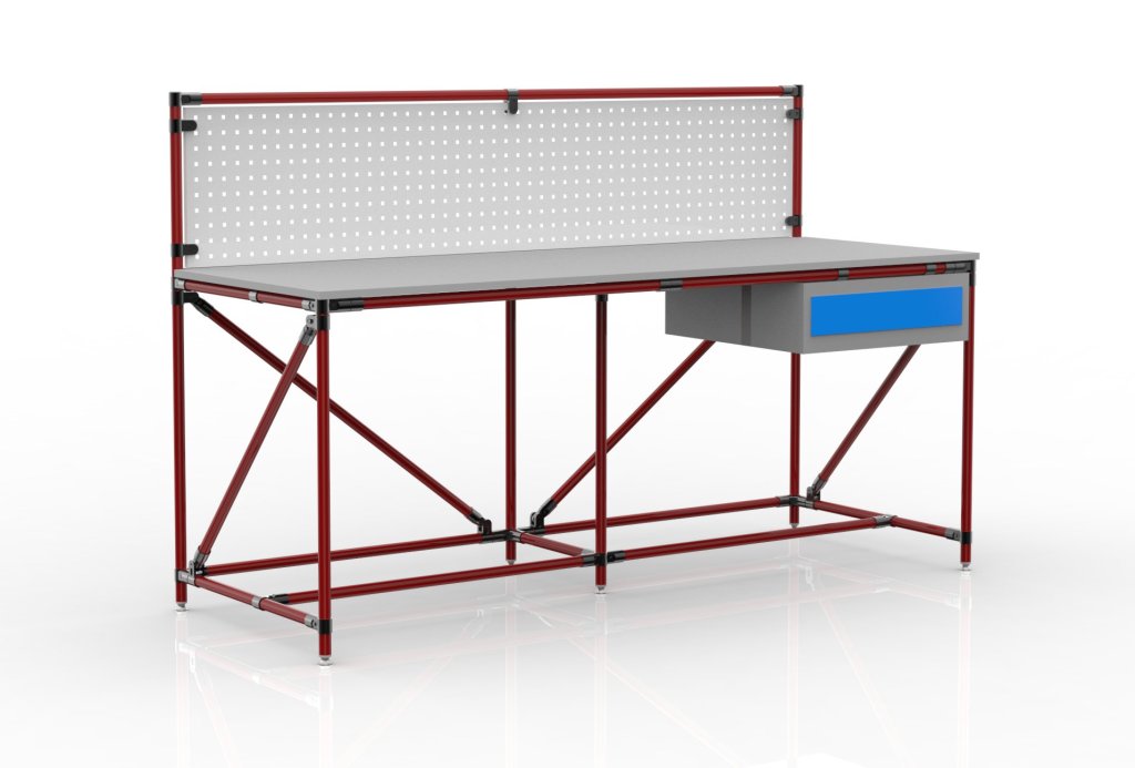 Werkbank mit Lochplatte aus dem Rohr-Baukastensystem. Der Tisch enthält eine beidseitig laminierte Spanplatte mit einer Dicke von 18 mm, einen Tischcontainer mit drei Schubladen, eine Lochplatte zur Aufhängung von Werkzeugen oder Kästen und vier verstellbare Füße. Tragfähigkeit bei gleichmäßiger Belastung von 100 kg. Abmessungen 1282 x 2000 x 750 mm.